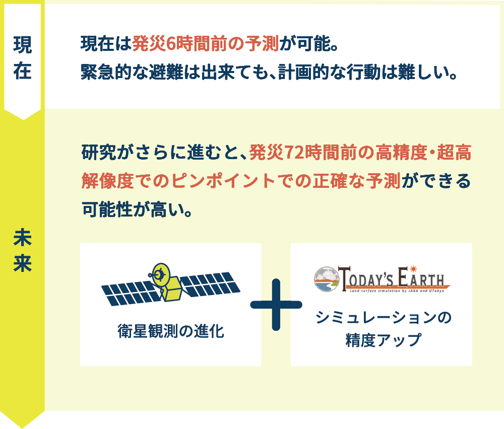 長時間洪水予測技術とは、洪水の発生をいち早く予測する技術のことです。現在は気象庁により最大6時間先までの予測情報が提供されていますが、衛星観測とモデルシミュレーションとの融合により、将来的には24時間以上先の予測情報の提供が可能となります。